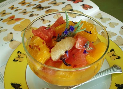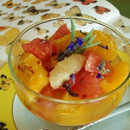 Peel the citrus fruit, removing all the pith and seeds. Cut into bite-size pieces and place in a glass bowl; pour spiced syrup over all, stir to mix. Cover tightly and refrigerate for several hours. Serve in a clear bowl to show off the pretty colors. Garnish with fresh lavender flowers.