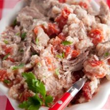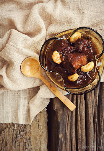 Filipino-style pork marinated in soy sauce, vinegar, bay leaf, and whole peppercorns for thirty minutes, then cooked with brown sugar to create a caramelized sauce.