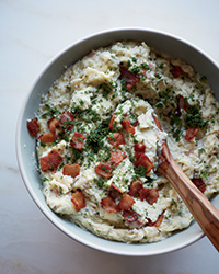 In the large saucepan, melt the butter in the milk over moderately low heat. Press the potatoes through a ricer into the pot and mix well. Fold in the mayonnaise, bacon, onion mixture, and parsley and season with salt and white pepper. Serve right away.