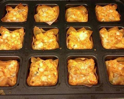 3. Start layering your cups. Begin with a wonton wrapper and press it into the bottom of each muffin tin. Spoon about a tablespoon of the chicken mixture. Top with another wonton wrapper and add another tablespoon of chicken mixture. Sprinkle with remaining cheddar cheese and a little blue cheese.