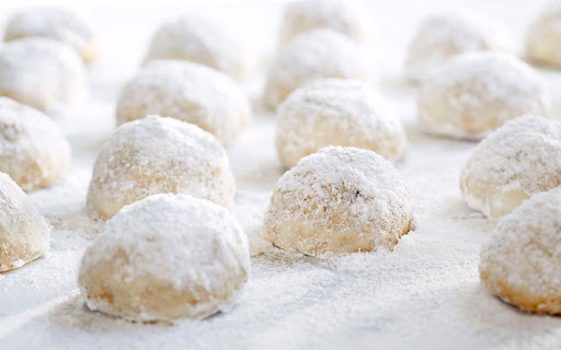 3. Place confectioners' sugar in pie plate. While cookies are hot, with metal spatula, transfer 4 or 5 cookies at a time to pie plate with confectioners' sugar. Gently turn cookies with fork to generously coat with sugar. Transfer cookies to wire rack to cool completely.