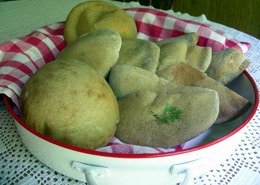 Open the oven and place as many pitas as you can fit on the hot baking surface [I made 2 at a time on my baking stone]. They should be baked through and puffy after 3 minutes. If you want your pitas to be crispy and brown you can bake them for an additional 3 to 5 minutes, but it isn’t necessary.