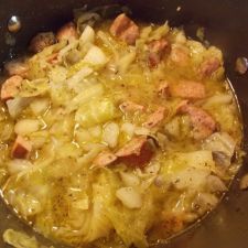 5) In a large pot, boil water and blanch the whole cabbage for 3 minutes, drain, cool 10 seconds under cold water, and repeat the procedure again. ( blanched cabbage, whole, in order to protect the delicate inner leaves, and blanched twice to make it more digestible).