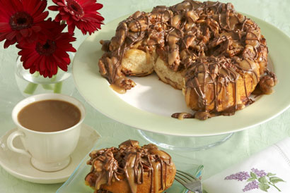 1. Melt butter together with brown sugar. Spread around bottom of an 8" round greased cake pan and top with pecans. Unroll the cinnamon roll, add SNICKERS® Bars evenly between the 5 rolls and reroll each piece separately. Place the 5 rolls around the cake pan.