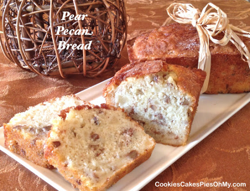 Preheat oven to 350°. In large bowl with electric mixer, cream butter and sugar. Add eggs and vanilla; mix well. Chop pears fairly small and mix into creamed mixture. In another bowl, stir together flour, baking powder, baking soda, and salt; set aside. Put reserved juice into liquid measuring cup and add enough milk to make 1 cup. Add dry ingredients to creamed mixture alternately with pear juice mixture. Fold in chopped pecans. Spray three small loaf pans with nonstick spray and pour batter into pans. Sprinkle with cinnamon sugar. Bake for 35 minutes. Cool in pans for 10 minutes, remove from pans and cool completely on wire rack.
