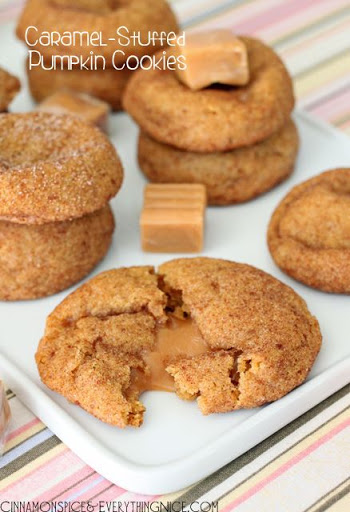 Soft cinnamon-spiked pumpkin cookies with surprise caramel centers. Stuffed inside each one is a sticky Kraft caramel that melts to form the filling. They have a subtle pumpkin flavor highlighted by cinnamon both inside and out.