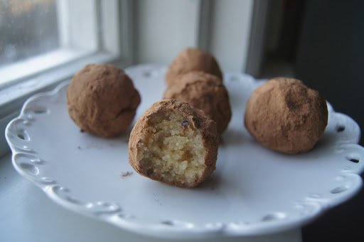 2. Roll about 1 tbsp. of dough to form a ball, then roll in cocoa powder (or cocoa + cinnamon/coconut mixture). Place in sealed container and refrigerate until chilled. Keep refrigerated (or freeze for firmer truffles).