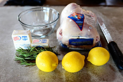 Use your fingers to smear the butter mixture all over the chicken, under the skin, and inside the cavity. Cut the lemons in half and squeeze the juice of one lemon all over the chicken. Place the six lemon halves (if they'll fit!) and the three remaining rosemary leaves into the cavity of the bird.