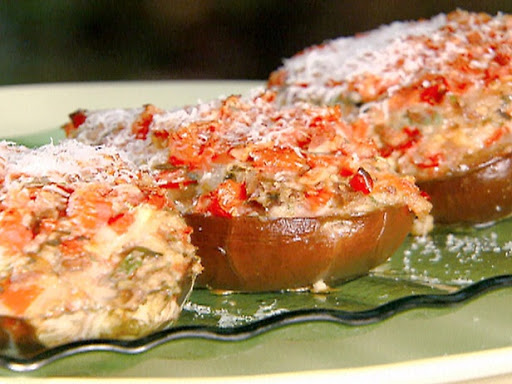 Fill the scooped-out eggplant halves with this mixture, dividing it evenly among the 2 halves.