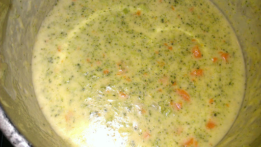 Bring broth to a boil. Add broccoli, carrot and onion and butter. Cook for five minutes or until broccoli and carrots are tender. I took a potato masher and mashed up the vegies a bit.