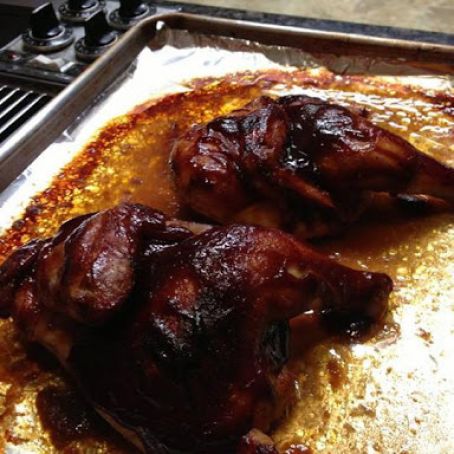 2. Coat top side of each piece of chicken with "Carolina Treet" (This is a tangy cooking BBQ sauce made in Wilmington NC and found in most grocery stores in NC. The bottle has a website www.carolinatreet.com and number 1-800-616-6344 written on it)