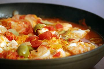 Heat 4 T. olive oil; add chopped onion and minced garlic. Saute until soft. Add 2 lb. tomatoes and bay leaf, oregano, green olives, and salt to taste. Cook the sauce until some of the juices have evaporated and it has thickened up a bit.