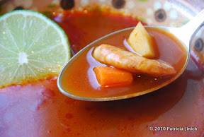 In a large saucepan, heat the oil , add the tomato/chile puree, and cook over high heat, stirring and scraping the bottom of the pan from time to time to prevent sticking, until reduced--about 10 minutes. Add the chick-peas, whole shrimp, shrimp powder, carrots, potatoes, water and salt to taste; set over low heat to simmer for about 1 hour. By this time the shrimps will be soft, the vegetables tender, and all the flavors amalgamated. Dilute with 1 cup of water if too concentrated. Top with olive (or avocado oil) onion and lime.