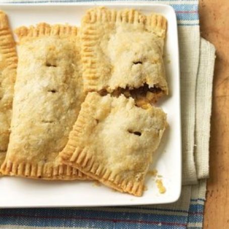 On a lightly floured work surface, roll each crust into a 14-inch square; cut each into 4 equal squares. Place 1/2 cup filling on one half of each square, leaving a 1/2-inch border around the filling. Brush borders with water; fold dough over filling to enclose. Crimp edges with a fork to seal. With a paring knife or scissors, cut 3 small vents in each.