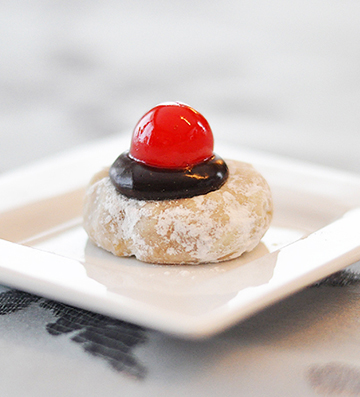 6.Using a pastry bag or small spoon, fill each cookie indent with a mound of melted chocolate. Allow chocolate to set a few minutes, then add well-drained maraschino cherry to top of each cookie. Serve immediately or refrigerate no more than 2 hours.