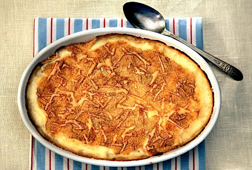 5. Butter a 6-cup gratin dish and spread a thin layer of the sauce evenly over the bottom. Arrange the cooked cauliflower and potatoes in an even layer over the sauce. Pour the remaining sauce over the top and spread evenly with the back of a spoon. It should come about three-quarters of the way up the vegetables.