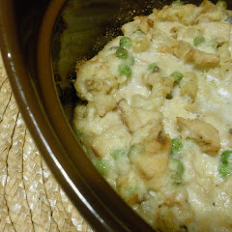 In a large bowl combine all ingredients, except last two. If too thick, thin out with a little milk. Bake covered at 375 degrees for 30 minutes. Remove lid or foil, sprinkle with parmesan cheese and dots of butter. Bake an additional 15 minutes until golden brown.