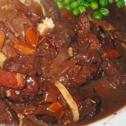 Heat the remaining oil in the skillet. Add the onion and carrot from the marinade, along with the additional onion that you've chopped, and saute for 5 minutes, or until tender. Transfer this mixture to the bowl with the meat and bacon, again using a slotted spoon, and return skillet to the heat. Add the flour to the skillet, combining with the oil and stir until well mixed and brown, about 2 minutes.