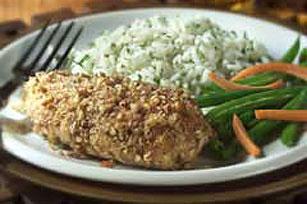 COMBINE nuts, bread crumbs and margarine. Sprinkle over chicken; press lightly into chicken to secure.