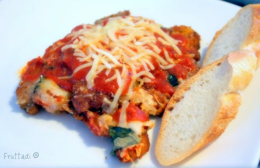 Cuando tengas todos filetes de pollo frito coloca un poco de salsa en el fondo del molde para horno y luego acomoda el pollo y viértele el resto de la salsa y con los quesos encima, hornea hasta que el queso se derrita y esté ligeramente dorado, unos 3 minutos. Adornar con un poco de albahaca picada antes de servir