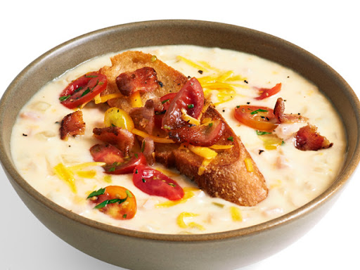 Toss the tomatoes, parsley, and salt and pepper to taste in a bowl. Ladle the soup into bowls and top with the toasted baguette, the remaining 1/2 cup cheddar, the tomato-parsley mixture and bacon.