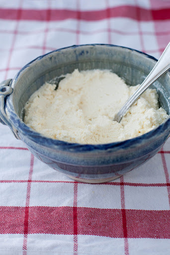 Very carefully pour the mixture into the prepared colander. If you want to reserve the whey, be sure to place a bowl underneath the colander. Let drain about 8-12 minutes (shorter for a moist result, longer for a drier end product. Moist is best for an appetizer-type spread, drier is better for lasagna and the like.) Transfer the curds to a bowl, stir, cover, and refrigerate until chilled. Store up to 5 days.