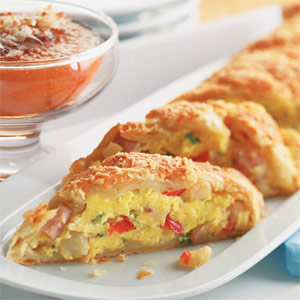 Unfold a pastry sheet on a work surface that’s been lightly dusted with flour. Roll pastry lengthwise into 10x12-inch rectangle. Transfer pastry to a piece of parchment cut to fit a baking sheet. Trim pastry, fill with half the egg mixture, and braid as illustrated in Steps to Success. Repeat with remaining pastry and egg filling. Lift parchment and strudels onto baking sheets.