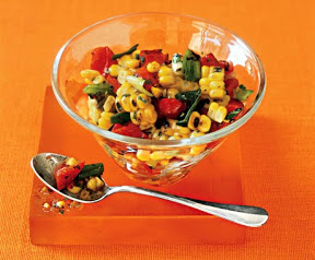 Prepare barbecue (high heat). Brush bell peppers, corn, and green onions with some olive oil. Grill vegetables until well charred in spots, turning occasionally with tongs and removing pieces as they brown, 5 minutes for green onions, 10 to 15 minutes for bell peppers and corn. Cool slightly. Cut bell peppers and green onions into 1/3-inch pieces. Cut corn off cob.