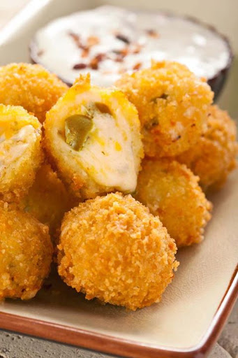 Heat counter top fryer or frying pan filled with oil to 360 degrees. Fry cheese balls for about 1 1/2 minutes on until golden brown. Place fritters on a plate lined with paper towel to absorb excess grease. Serve immediately with ranch dressing for dipping.