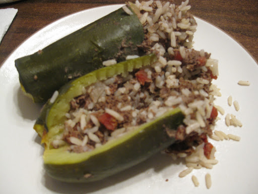 Mix all other ingredients together and using this meat mixture, stuff the zucchini.