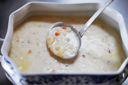 Remove from heat and stir in 1 cup half-and-half. Add mixture to the simmering soup. Allow to simmer for 15 to 20 minutes. Check seasoning and add more salt or pepper if necessary.