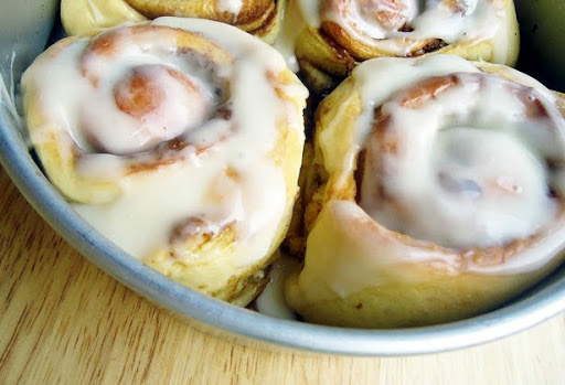 Take the cinnamon rolls out of the oven. Frost them while they’re still warm. Enjoy!