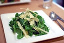 Toss the arugula in a large bowl with enough of the dressing to moisten; divide among 4 plates. Place a steak on top of each salad. Shave the Parmesan onto each steak with a vegetable peeler, sprinkle with salt, and serve hot.