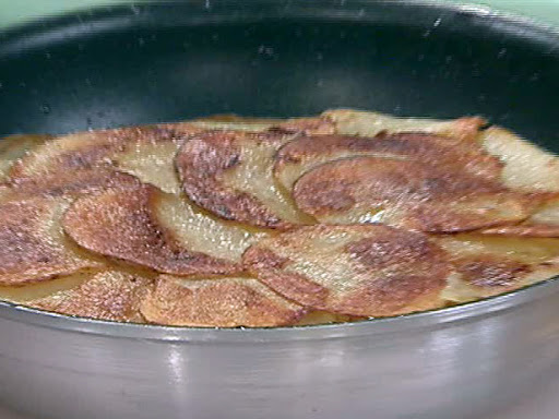 Place the pan of potatoes over medium heat and cook until the olive oil begins to sizzle and the potatoes begin to brown on the bottom. Put the pan in the oven and bake for 20 to 25 minutes. Remove the pan from the oven and place a tight fitting lid on the pan. Drain the excess oil out the side of the pan. THIS STEP IS EXTREMELY IMPORTANT!!! After the excess oil has been drained, completely flip the pan so the cake is turned out onto the bottom of the lid, then slide the cake off the lid back into the pan so the brown side of the cake is now up and the top becomes the bottom. We see now why draining the excess oil is important. If you attempt this without draining the oil it will drain out on your wrist and burn you.