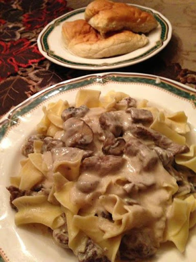 In a frying pan on medium heat, brown steak vegetable oil. Add mushrooms and onion to the browned meat and sauté together until onions are a golden brown and mushrooms are tender. Add the meat mixture in the pan to the sauce in the crockpot. Turn to low and cook 4-6 hours with a tight lid. Serve over extra-wide egg noodles, cooked as directed on package.
