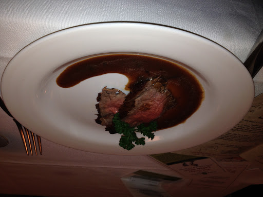 Carve beef into 1/2 inch slices, fan out on 4 plates and spoon truffle sauce around beef. Serves 4.
