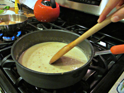 While the champagne and onions are cooking, heat but don't boil the velouté sauce.