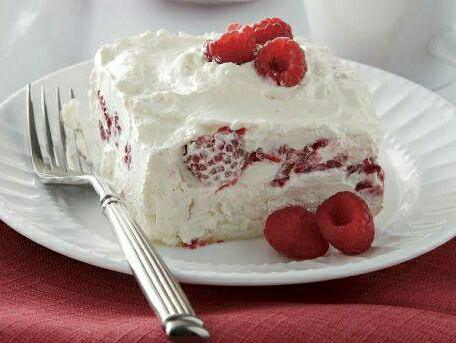 Place all angel food cake pieces in bottom of 9x13 baking dish then pour the raspberry mixture over the cake.