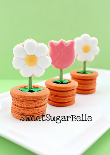 Also, have several mini-flower cookies decorated and ready to go. A good technique for decorating these would be my 20-second icing. It would be a good idea to decorate them the same day you complete the steps above so they will all be dry and ready to go on day two.