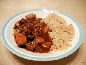 Se lava la carne y se corta en pedazos. En una cacerola se pone la manteca de puerco, sal, un vaso de agua y los tres dientes de ajo, se le agrega la carne en pedazos y se pone a dorar. Cuando se reseca el agua se le quita un poco de grasa y se le agrega el piloncillo ya desbaratado.