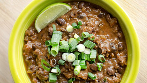 1. Add a little vegetable broth to a pan and sautee onion and garlic until tender. Add chili and cumin, stir until combined. Add beans, salsa, vegetable broth, lime juice and chipotle hot sauce. Bring to a boil, then cover and simmer about 45 min.