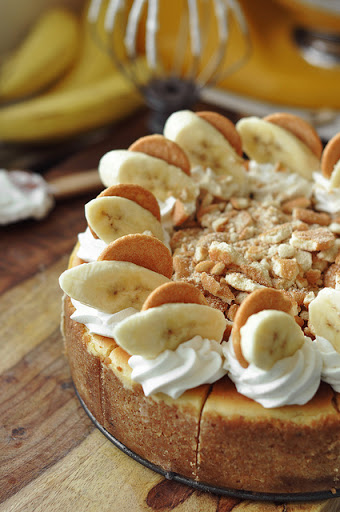 In a large bowl add the cold heavy whipping cream. Beat until the cream begins to thicken. Add the powdered sugar and bourbon or vanilla extract if using. Continue to beat until the cream forms soft peaks. Cut the cheesecake into slices and pipe whipped cream onto each slice. Top with a vanilla wafer cookie and a banana slice. Sprinkle the middle of the cheesecake with the crushed vanilla wafers. Serve right away. Store any leftovers in the fridge covered with plastic wrap. Will keep for up to 5 days. Enjoy!!
