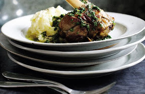 5. Divide the lamb shanks between plates, strain over the sauce and spoon over the gremolata. Serve with mashed potato.
