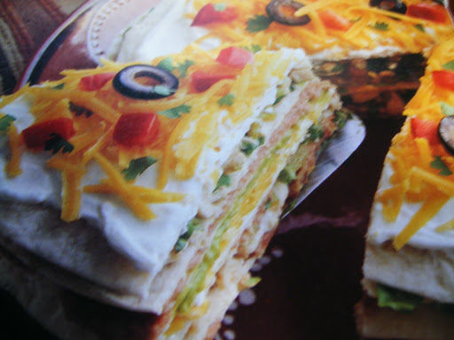Place one of the tortillas on a large platter. Spread with half of the avocado dip. Then top with a second tortilla. Spread with half of the refried beans. Cover with a third tortilla. Sprinkle with half of the chicken-lettuce mixture. Add a forth tortilla. Spread with half of the sour cream sprinkle with half of the cheese. Repeat layers, ending with sour cream and cheese. Garnish with tomatoes, olives, and cilantro. To serve, cut into wedges. If desired, serve with salsa.