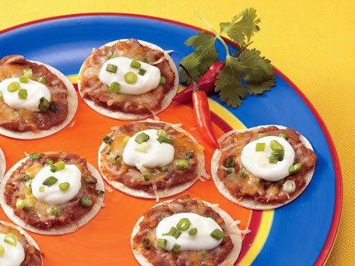 2 On ungreased large cookie sheets, place tortilla rounds with sprayed sides down. Spread each round with beans. Set aside 1 tablespoon of the onions. Sprinkle rounds with remaining onions and cheese.