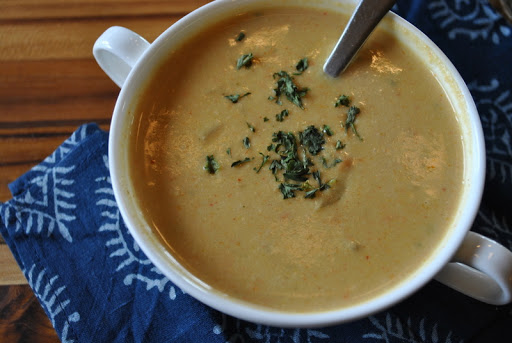 Method: In a large soup pot, saute the onion, carrot and celery over medium heat until the onion is translucent, about five minutes. Add the garlic and saute for a couple minutes more. Add the potatoes and the vegetable broth and bring to a boil. Then reduce heat to a simmer and cover and let simmer for 15-20 minutes. While the soup is simmering, blend the water, cashews, nutritional yeast, tomato paste, miso, lemon juice and remaining spices until very smooth and creamy. Pour into the pot of soup and let cook for a few minutes more, the cashew cream will thicken the soup a bit. For a thicker, creamier soup (like the one pictured), put half the soup through the blender or pulse several times with a stick blender.