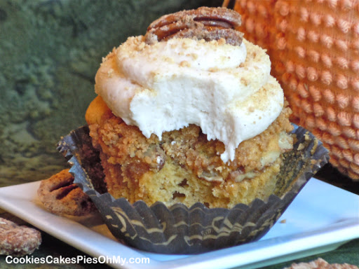 Pumpkin cupcake with a streusel topping made of candied pecans & graham cracker crumbs and cinnamon spiced buttercream frosting. What's not to love!?