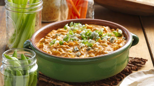 Top the hot dip with sliced green onions mixed with crumbled blue cheese.