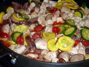 In a large skillet, saute onions and garlic in olive oil for about 1 minute on medium high heat. Add chicken and season with salt and pepper. Cook about 5 minutes. Add sausage and continue to cook until meats brown on each side. Add remaining ingredients, stir and cover with a lid. Cook until squash is tender.