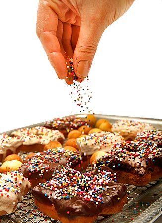 10. Drain the doughnuts on a rack and cool slightly, then frost and decorate as desired.